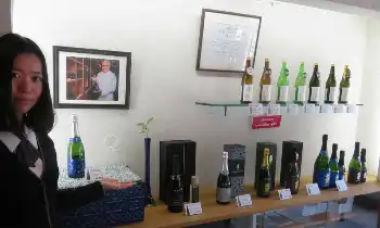 そんな歴史ある蔵元が「乾杯にふさわしい、世界に誇れる日本の酒を」と、5年かけて開発したのがスパークリング日本酒。2015年の七賢スパークリング「山ノ霞」を皮切りに、近くのサントリー白州蒸留所のウイスキー樽に七賢を寝かせた「杜ノ奏」や、史上最年少で3つ星を獲得した仏人シェフとコラボした「アラン・デュカス スパークリングサケ」など6種類を発売。すべて1度発酵した日本酒を瓶内で再度発酵させる瓶内2次発酵によるもので、ショップ「酒処大中屋」で販売している。カウンターの試飲コーナーで山ノ霞を飲んでみたが、麹の甘みとまろやかな酸味、フルーティーな香りが相まって、さわやかなのどごし。泡が美しく、とても飲みやすい。