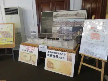 佐賀銀行としての営業は98年(平9)年まで続き、14年から一般公開。1階に網目張りのカウンターを介して広々とした吹き抜けロビーと執務室があり、金庫の中では1億円の新1万円札束(計10キロ)を持つ体験ができる。記念館は2階で、辰野が設計した東京駅や日本銀行本店、武雄温泉楼門などの有名な建物の模型がズラリ。あらためてその才能に驚かされた。入場無料。(電)0955(70)1717。