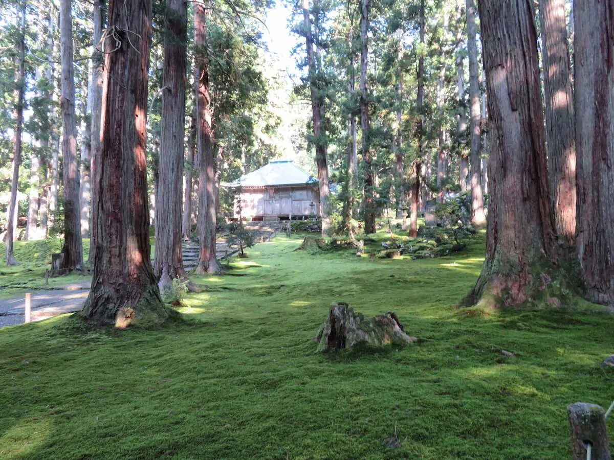 大瀧神社で泰澄の名前に触れて、えちぜん鉄道勝山駅からバスで13分の、勝山市にある平泉寺白山神社を訪ねた。717年、同じ泰澄によって開かれた白山信仰の拠点で、戦国時代には6000の坊院が建ち、8000人の増兵がいたという。だが、一向一揆で全山が焼失。現在は森閑として境内には美しい緑の苔が広がり、杉木立の間から拝殿が見える光景は別世界のよう。2015年に、ここで撮影された同じJR東日本の吉永小百合のCMを思い出した。