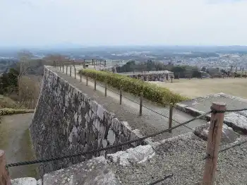 城内には落城の際に割腹した藩士・丹羽和左衛門らの自尽の碑や唯一の江戸期の建造物の茶亭「洗心亭」、門の土台となる石垣と門柱の礎石が残る「搦手門跡」など、見どころは多いが、圧巻は箕輪門から徒歩約15分の「本丸跡」(標高345メートル)。総工費5億3000万円、2年かけて復元されたもので、周囲を高石垣で固められ、枡形門や天守台がある。天守閣はなかったというが、眺望は最高。北側の眼下には福島市の町並みが広がり、西側には安達太良山がそびえる。まさに360度の大パノラマだ。