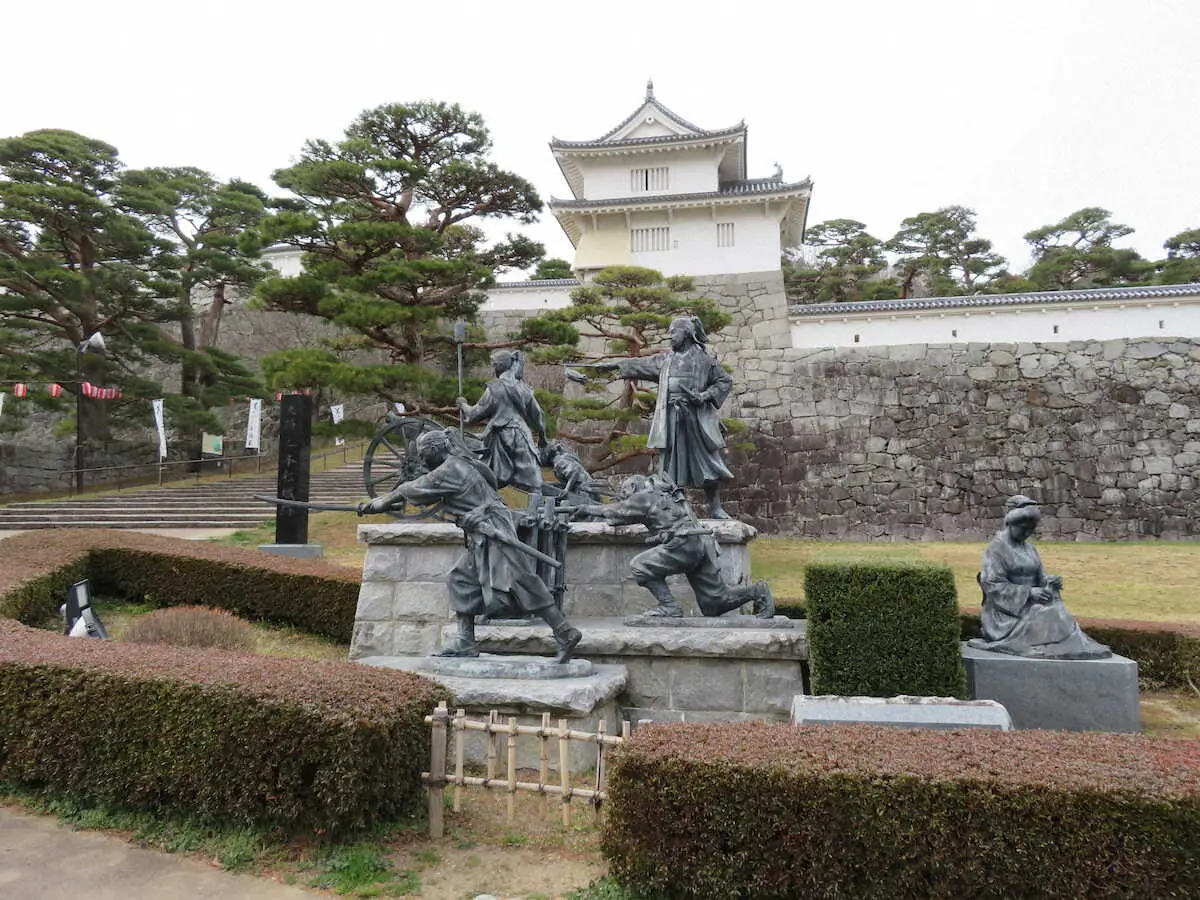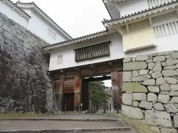少年隊が命がけで守ろうとした城は、室町時代の1414年、畠山満泰が築城し、1643年から丹羽氏が居城にした平山城。現在は日本百名城の一つで国指定史跡に指定されており、群像を過ぎてくぐった「箕輪門」は初代藩主・光重が最初に建造した櫓門(やぐらもん)。主柱のカシの巨木は箕輪村・山王寺山の神木を用いたことから、その名が付いたという。