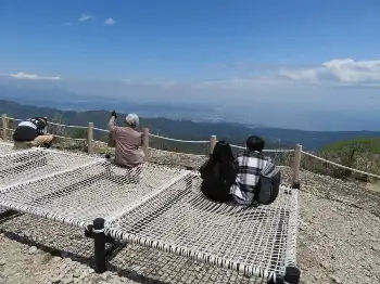 圧倒的な景観は続く。展望デッキから徒歩約5分の「海ノニワ」は、東側の展望広場に張られたネットベンチ。2×1・5メートル、高さ約40センチの白いネットが7張りあり、座ったり、寝そべったりしながら目をやると、強羅の街並みや相模湾、それに続く小田原から千葉・房総までが一望の下。空気が澄んでいれば、東京スカイツリーを見ることもできるという。