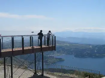 眼下には芦ノ湖を始め、箱根町の街並みや箱根外輪山が広がり、その向こうには沼津市の街並み、駿河湾、伊豆半島までを望むことができる。階段状になったデッキは座っても楽しめるが、圧巻は右端に設けられた“突き出しデッキ”。地面から約3メートルの高さまでせり出しており、足を踏み入れればスリル満点。都心とは10度気温が違うというそう快感と、絶景に飲み込まれるような浮遊感に包まれた。