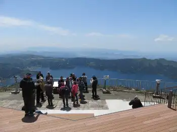 最後は駅舎から西側に歩いて約3分の「富士ノガク」へ。高さ2・5メートル、幅3・6メートルの巨大フォトフレームで、富士山をバックに思い出の写真を撮ることができる…はずも、主役は依然“雲隠れ”。ガクから徒歩約5分の、山頂(同1356メートル)にたたずむ箱根元宮(もとつみや)神社での祈りもかなわなかったが、芦ノ湖とソラ(空、宙)を結ぶ場所としてネーミングされたという芦ノソラ。確かに2つが溶け合う絶景パノラマスポットだった。