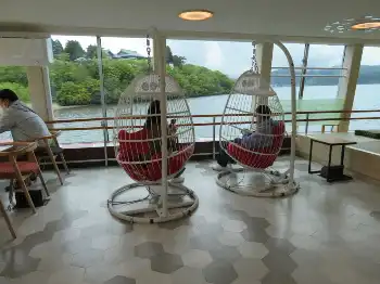 船内に乗り込むと、1階のキャビンには大きな窓越しに操舵室が見えるキッズスペース、2階には湖を見ながらゆっくりと過ごせる畳の小上がりスペースとゆりかごチェア、カウンター席、赤富士をイメージしたソファなど、選ぶのが楽しいユニークな席ばかり。3階の「KAZEデッキ」に上がると、ブランコかと思ったらそれに似たベンチでビックリ。天然芝を敷き詰めた広場は生育のため立ち入り禁止だったが、天然のツタがはう船尾は涼やか。4階の「SORAデッキ」には記念撮影にピッタリの富士山モチーフモニュメントもあり、乗ってるだけで楽しい。