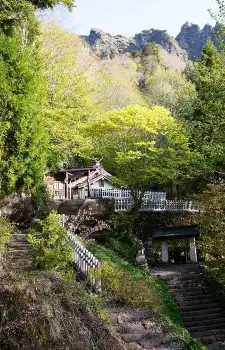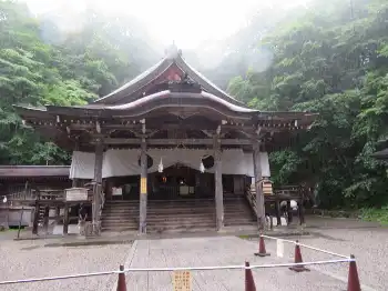 そんな神秘的な雰囲気も、坂道が始まると現実に引き戻された。勾配が増すに連れて息が切れ、続いて見上げるような階段。「もうすぐですよ」。すれ違う参拝客に励まされながら何とか登りきり、岩壁に沿うように建つ社殿に到着。手前に11月まで修繕中という九頭龍社がたたずむ。