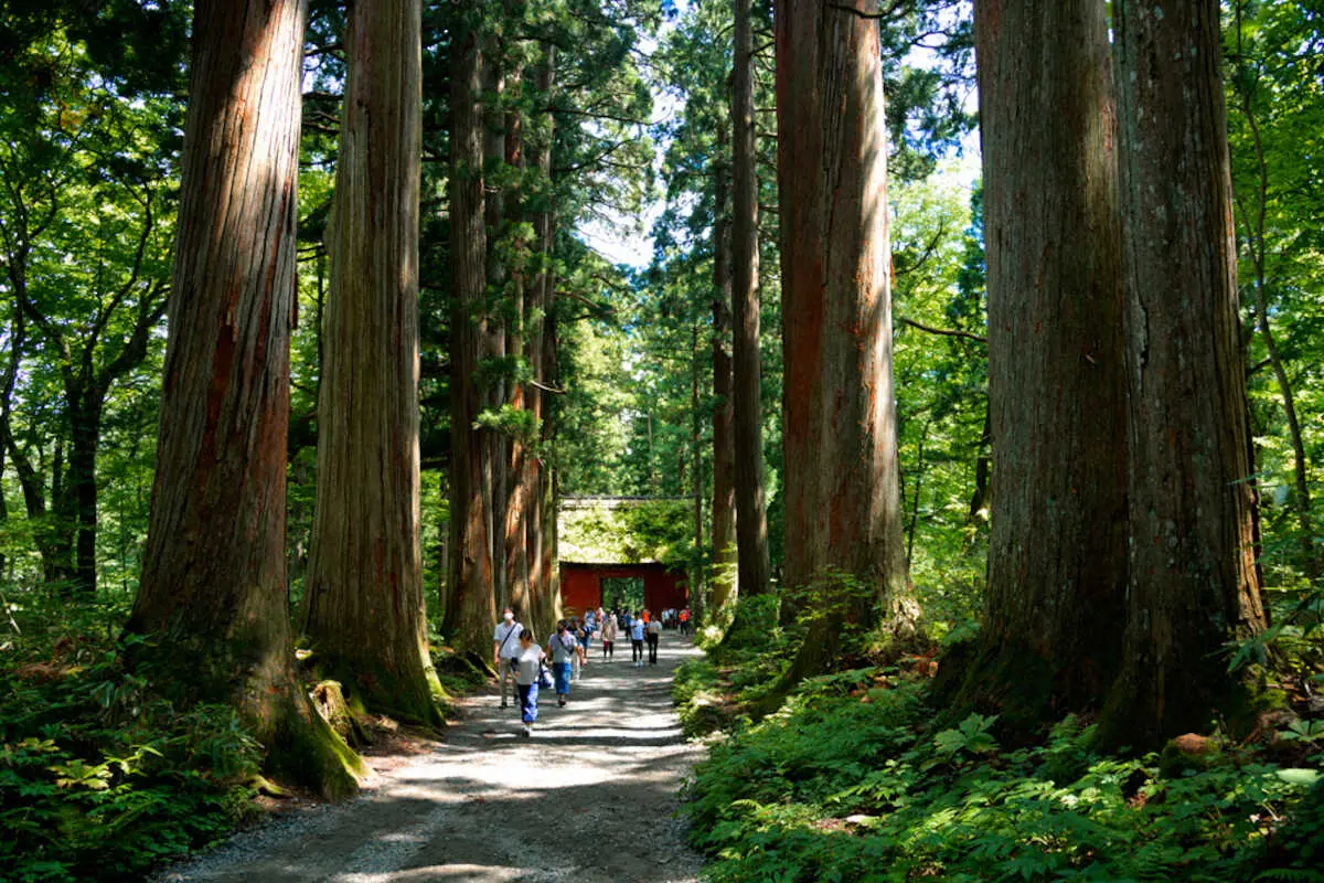 県道36号線を曲がって始まる参道は約2キロ。奥社と国宝善光寺を結ぶ戸隠古道の一部で、気を引き締めて大鳥居をスタート。辺り一帯は深い森で、気温21度の冷気が心地良い。平坦な道を1キロほど歩くと、茅葺きの朱色の随神門が見えてきた。門をくぐると、両側に樹齢400年を超える巨大な杉並木が約500メートル続き、神々しい空気が漂う。途中にはJR東日本のCM撮影で吉永小百合が入ったという洞が空いた「小百合杉」。しめ縄が巻かれ、思わず足を止めて手を合わせた。