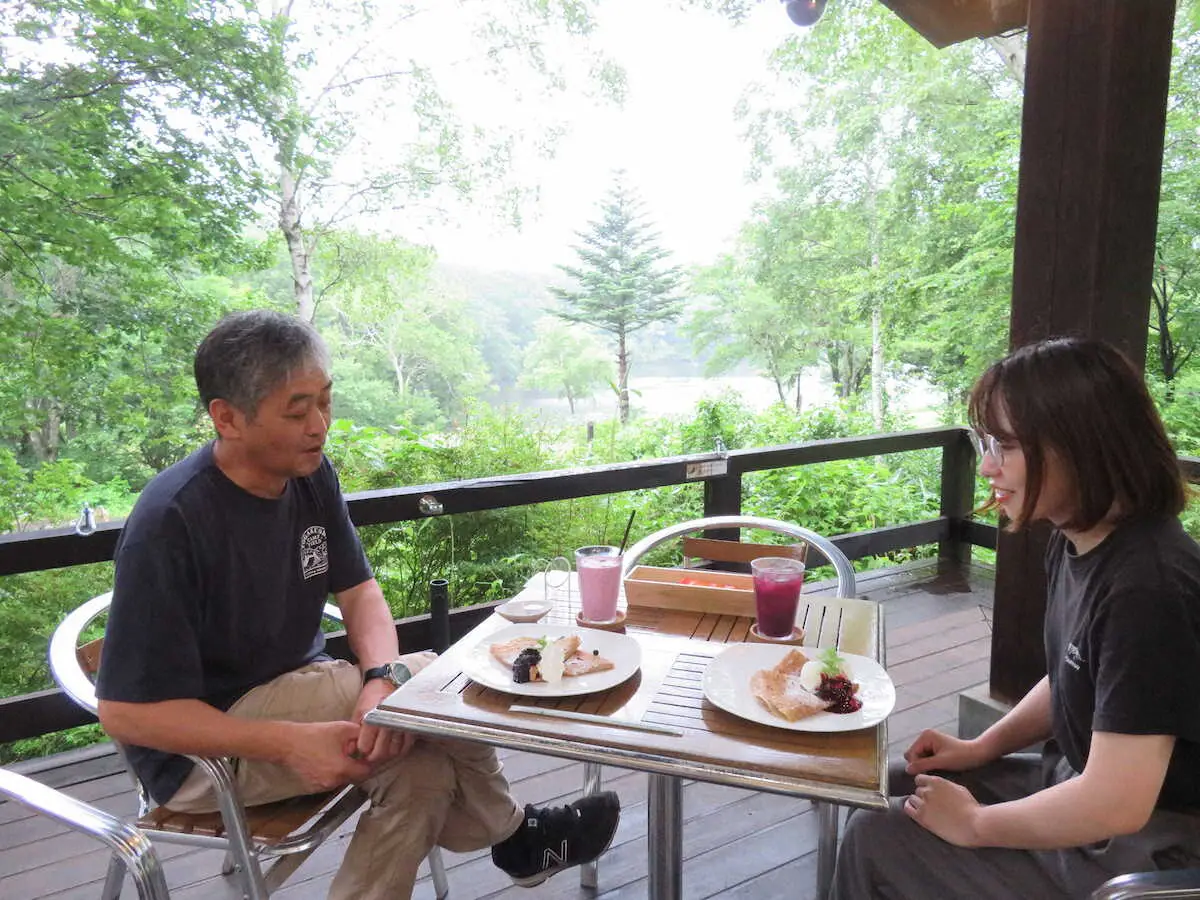 ガレットはそば粉を使った仏ブルターニュ地方の郷土料理で、丸くて平らな料理やスイーツの総称。同店でも野菜や卵などを盛り付けた食事向けのものから、ジャムなどが添えられたスイーツまで、いろいろなメニューを提供。その中から、珍しいナツハゼのガレット(税込み1460円)を、眼前に鏡池が広がるテラス席で味わった。ナツハゼとはツツジ科の和製ブルーベリーで、酸味が強いかと思いきや甘くて、香ばしいそば粉の生地にピッタリ。また、奥社からの帰り道、参道入り口にある、建築家・隈研吾氏設計のそば処「奥社の茶屋」=(電)同2222=では、そばソフト(400円)に舌鼓。ほんのりとしたそばの香りが疲れを癒やしてくれた。