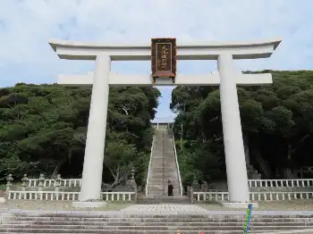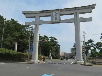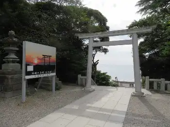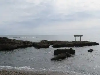 それもそのはず、岩礁は同神社の御祭神の大己貴命(おおなむちのみこと)と少彦名命(すくなひこなのみこと)が降臨したといわれる場所で「神磯」と呼ばれ、鳥居の名も「神磯の鳥居」。大洗磯前神社の複数ある鳥居のうちの1つで、高さ3・2メートル、幅4・5メートルの大きさ。1959年(昭34)に建てられ、「初日の出の名所」としても知られる。
