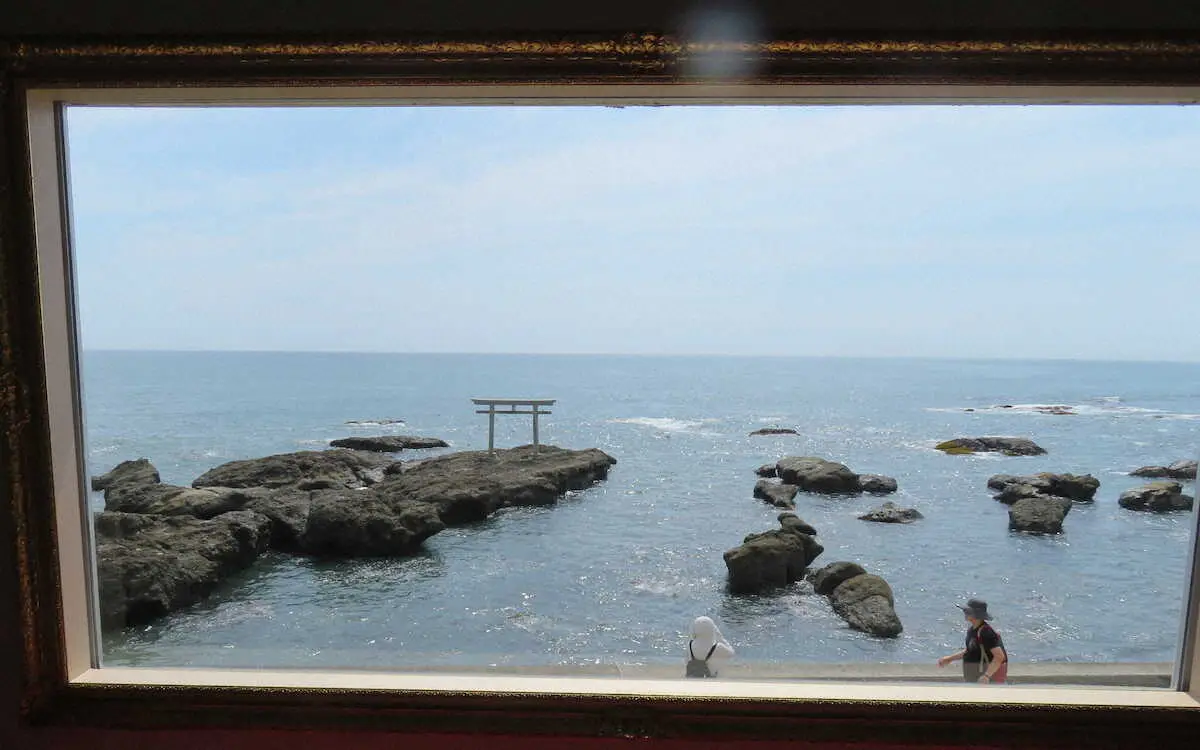ユニークな絵画があると聞いて、茨城県は大洗町を訪ねた。ガラス窓に額を付け大洗海岸の風景を絵画に見立てたもので、その名も「風景窓画(そうが)」。その中には岩礁に建つ鳥居の絶景が広がる。対面にはそれを見守るように平安時代の古社が遷座。近くにはサメの飼育種類数日本一の水族館もあり、都道府県魅力度ランキングで下位にいる県とは思えなかった。