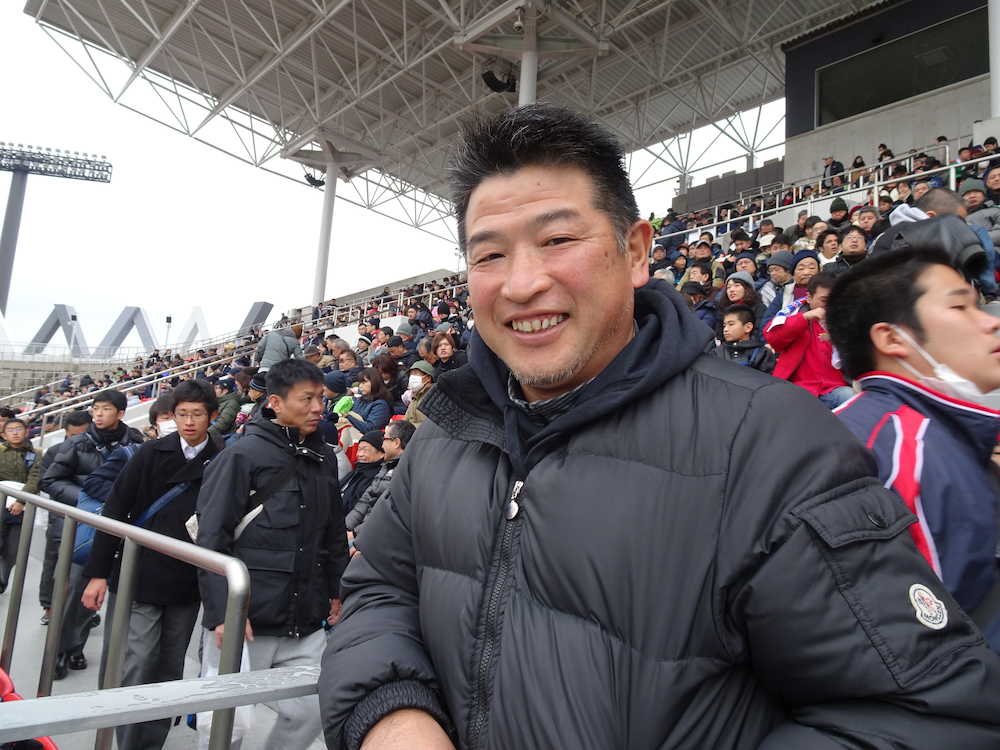 流通経大柏ではFB。3年時は千葉県決勝で敗れて、花園をあと一歩で逃した。楕円球を追った10代を思い出し「我々の頃は人工芝もなく、経験者も1学年に4、5人。完全に寄せ集めだね」と振り返った。同級生だったCTB星野利明さんの息子がNo・8竜輝(3年)とあって「余計に応援に力が入った」とスタンドの前から3列目で声援を送った。