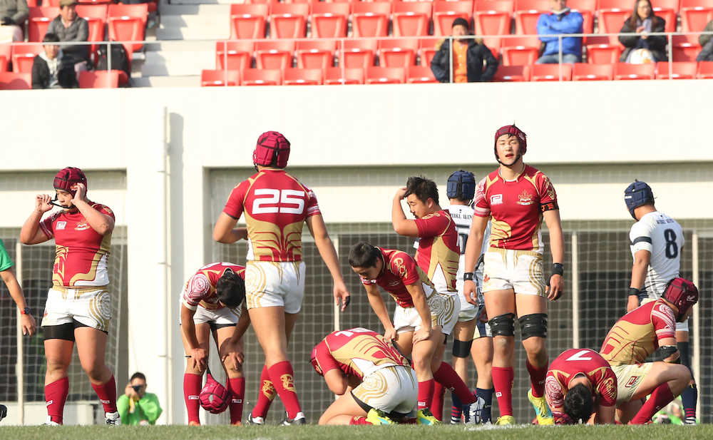プロップ葛西主将(3年)は「フィジカルの強さは想定していたが当たり負けた」と涙を流す。この日4強進出を果たしたサッカー部とのダブル優勝が消え、悔しさが募った。葛西は「あいつら(後輩)なら日本一を取ってくれると信じている」と夢を託した。