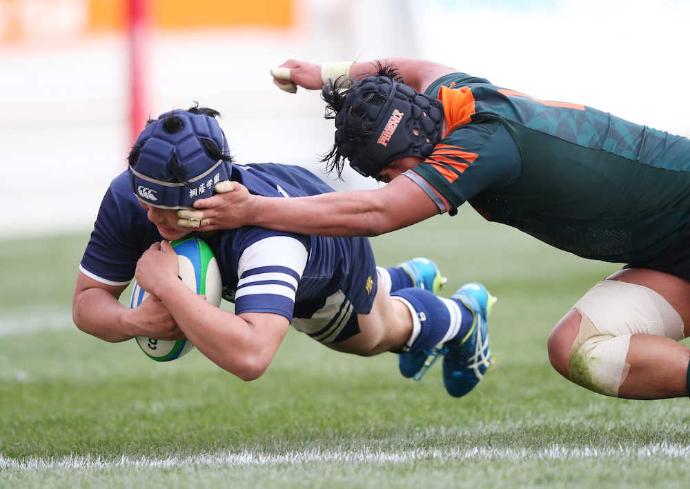 2試合が行われ、桐蔭学園(神奈川)は東福岡(福岡)を46―38で下し、3季ぶり6度目の決勝進出を決めた。両校合わせ11本のトライ合戦となったが、9月下旬の右足首脱臼骨折から奇跡的に回復して今大会初先発した桐蔭学園のフランカー西山周作(3年)がビッグタックルを連発。後半25分にはトライも挙げる活躍で、花園では過去1分け3敗だった東福岡に競り勝った。大阪桐蔭(大阪第1)は流通経大柏(千葉)に逆転勝ち。あす7日の決勝は、昨春の全国選抜大会と同じ顔合わせとなった。