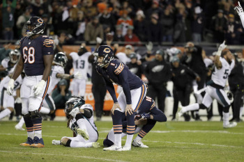 そして残り10秒となったところで、この日3つのFGを成功させていたキッカーのコーディー・パーキー(26)が登場。最初に蹴ったボールはクロスバーの間を通過した。成功ならばスコアは18―16となってベアーズの勝ち。しかしイーグルスはスナップの直前に最後のタイムアウトをコールしており、このプレーは無効となった。
