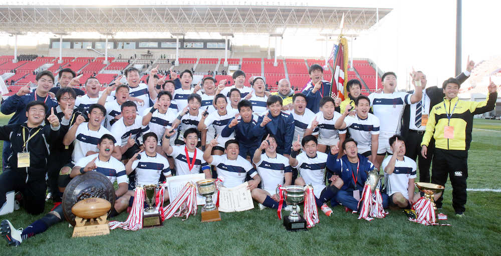 <大阪桐蔭・桐蔭学園>接戦を制して初優勝を飾り、歓喜の大阪桐蔭フィフティーン(撮影・北條 貴史)