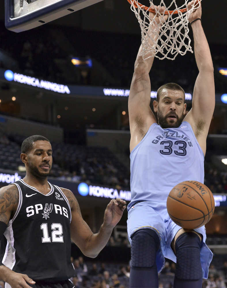 NBAは9日に各地で10試合を行い、不振に陥っていたグリズリーズは地元メンフィスでスパーズを96―86(前半42―41)で振り切って19勝22敗。センターのマーク・ガソル(33)が26得点、14リバウンドで今季16回目のダブルダブルを達成し、チームの連敗を6でくい止めた。