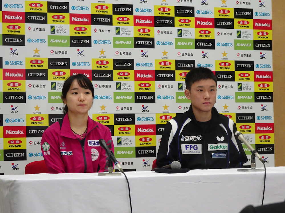 シングルスの前年優勝者として開会式後の会見に臨んだ張本智和と伊藤美誠