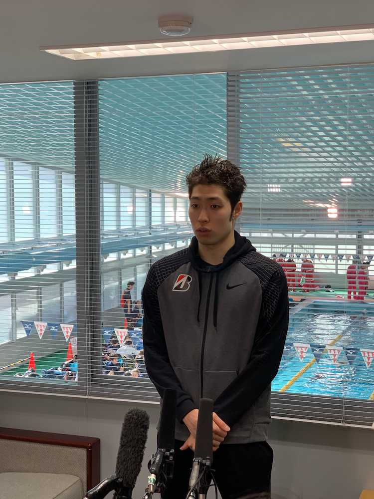 新年初レースを終え、取材を受ける競泳男子の萩野