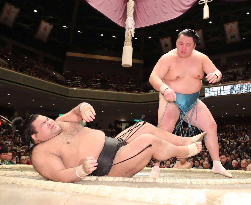 <大相撲初場所9日目>玉鷲(右)に押し倒しで敗れた高安(撮影・島崎忠彦)