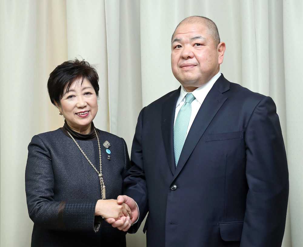 東京都の小池百合子都知事が20年東京五輪開催に合わせ、大相撲など日本の伝統文化を海外にPRするため、日本相撲協会を訪れ八角理事長(元横綱・北勝海)に協力要請を行った。