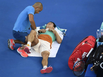 体が悲鳴を上げた。第1セットの第4ゲーム。サーブを打ち込んだ瞬間、錦織の右太腿に痛みが走った。第1セットを1―6で落とすと、たまらずメディカルタイムアウト。許された3分間でマッサージなどの処置を受けたがパフォーマンスは戻らなかった。第2セット1―4となった時点で途中棄権。「右太腿に強い痛みを感じ、右足で蹴ることができなくなった。曲げると痛かったので、ほとんどの動きが痛みに変わってしまった」と唇をかんだ。