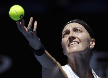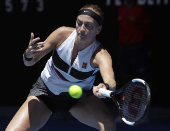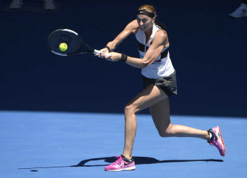 全豪オープン女子シングルス準決勝で強烈なバックハンドストロークを放つペトラ・クビトバ(AP)