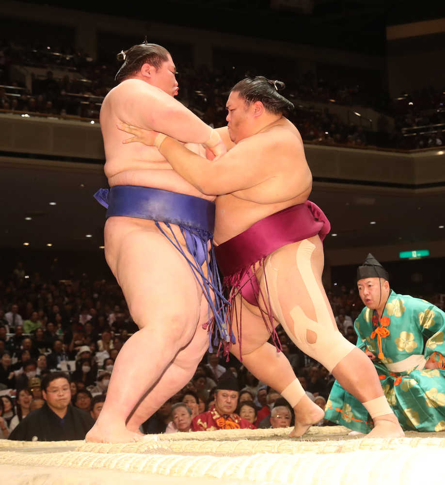 懐に入って押し続け、左も差して攻め切った。「前に出ていく意識だけ持って、足を出しました」。左脚にはテーピングが施され、歩き方も痛々しい。それでも三役の座を守ったことに「大きいです」と胸を張った。残る2日間へ「白星を貪欲に取りにいきたい」と気合を入れた。