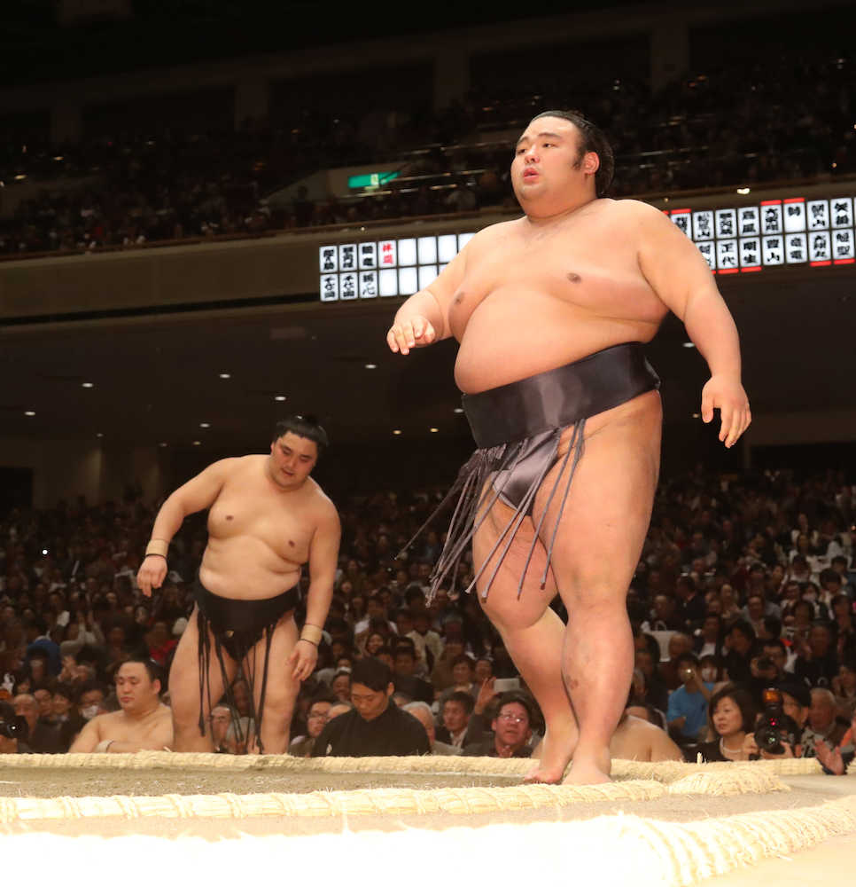 隠岐の海(左)を押し出しで破った貴景勝(撮影・郡司 修)