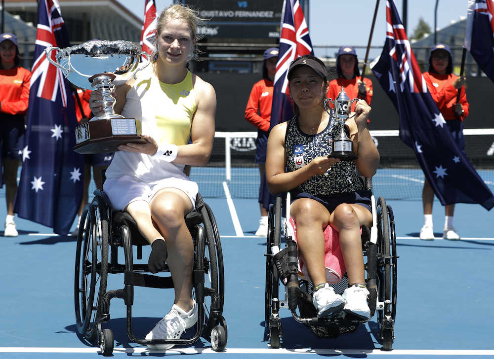 車いすの女子シングルス決勝で上地は2ゲームしか奪えずに完敗した。メルボルンでの前哨戦では倒していたデフロートに、2年連続で苦杯。「前回の戦いから相手は凄く展開を変えてきた。落ち着いてラリーができなかった」と唇をかんだ。