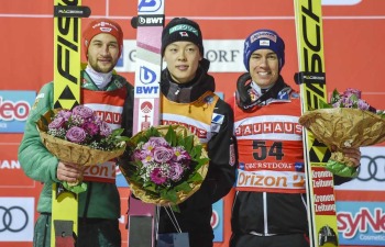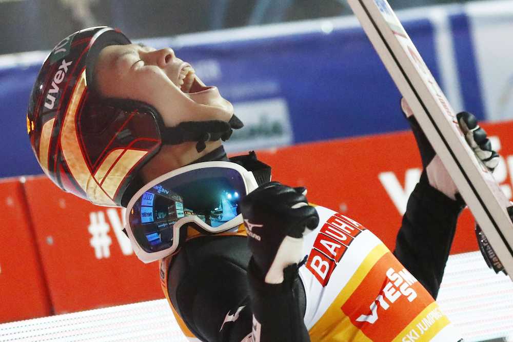 今季9勝を挙げたラージヒルに続き、200メートルを越える飛距離で争うフライングヒルでも初優勝。「今日のところは上出来」と上機嫌で話した。日本男子初のW杯総合優勝と、20日開幕の世界選手権(オーストリア・ゼーフェルト)へ弾みのつく1勝となった。