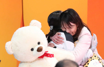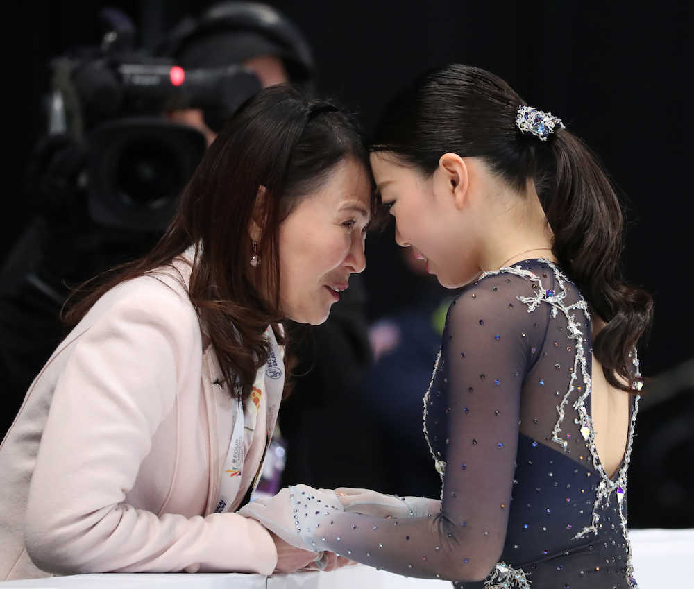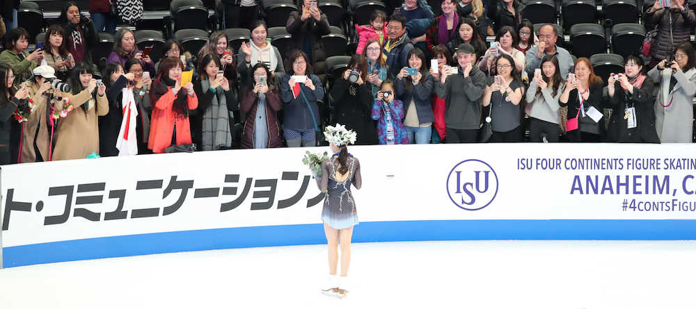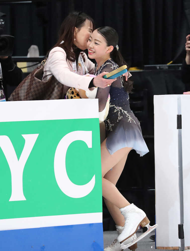 <四大陸選手権女子フリー>キス&クライで投げ入れられたクマのぬいぐるみを抱く紀平梨花。右は浜田コーチ(撮影・長久保 豊)