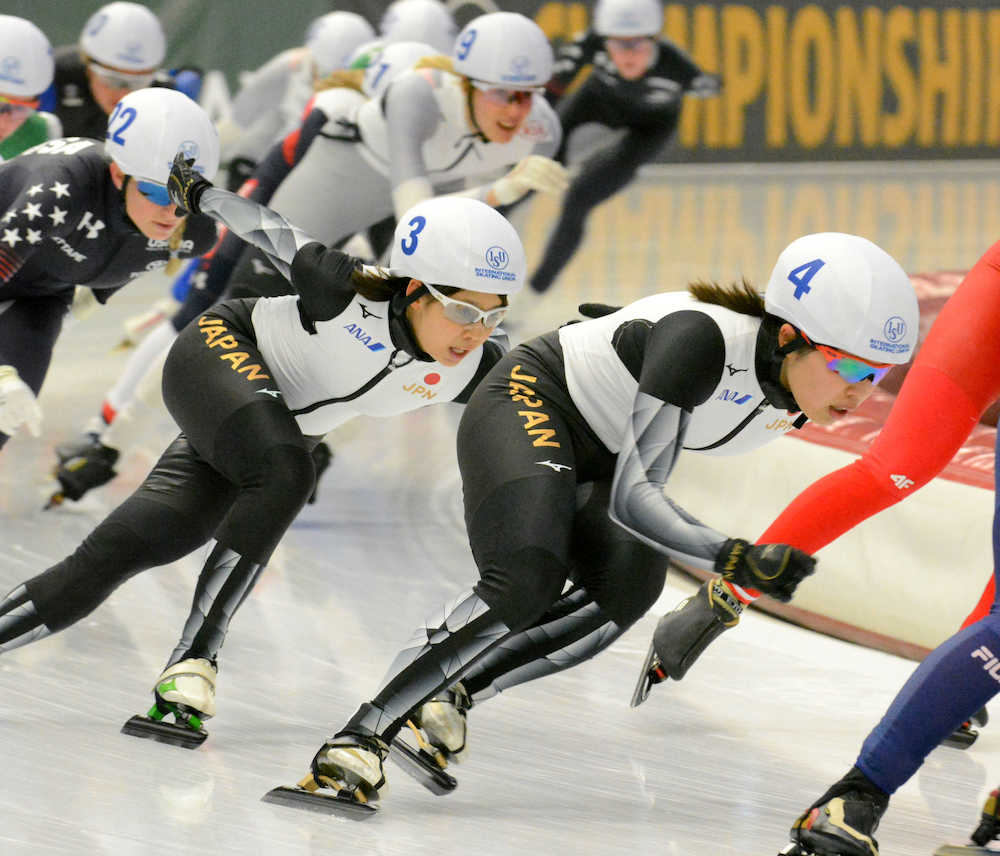 <世界距離別スケート最終日>女子マススタートの佐藤綾乃(4)と高木菜那(3)