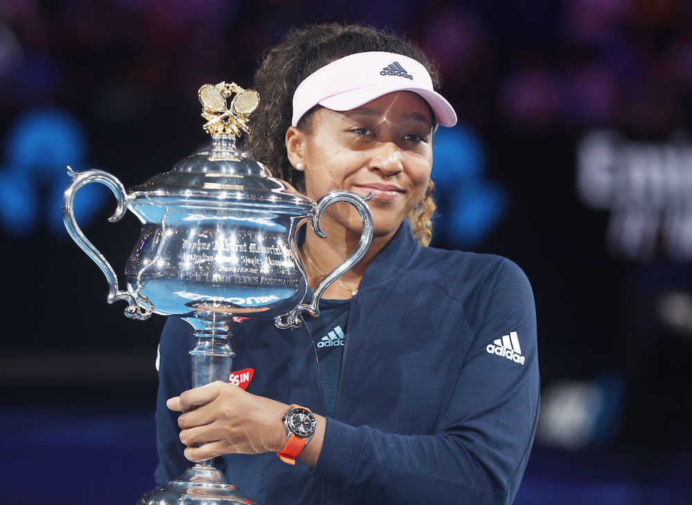 全豪OP女子シングルス表彰式で優勝トロフィーを手にする大坂なおみ