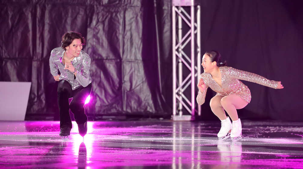 <浅田真央サンクスツアー>観客の歓声を受けて滑る浅田真央さんと無良崇人さん(撮影・小海途 良幹)