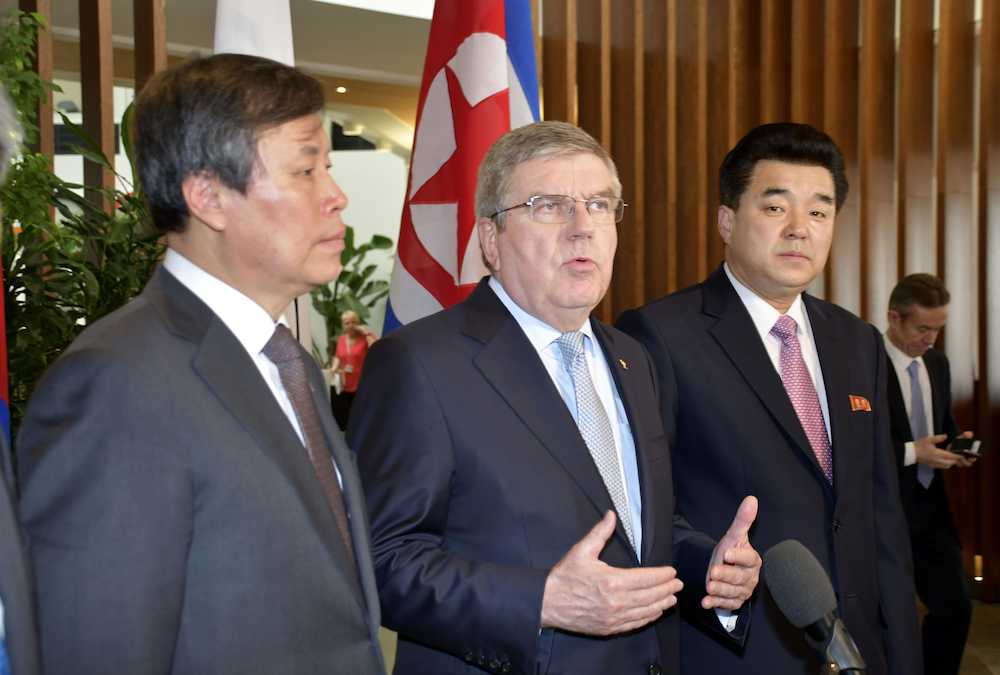 3者会談を終え、記者会見するIOCのバッハ会長。左は韓国の都鍾煥・文化体育観光相、右は北朝鮮の金日国体育相=15日、スイス・ローザンヌ
