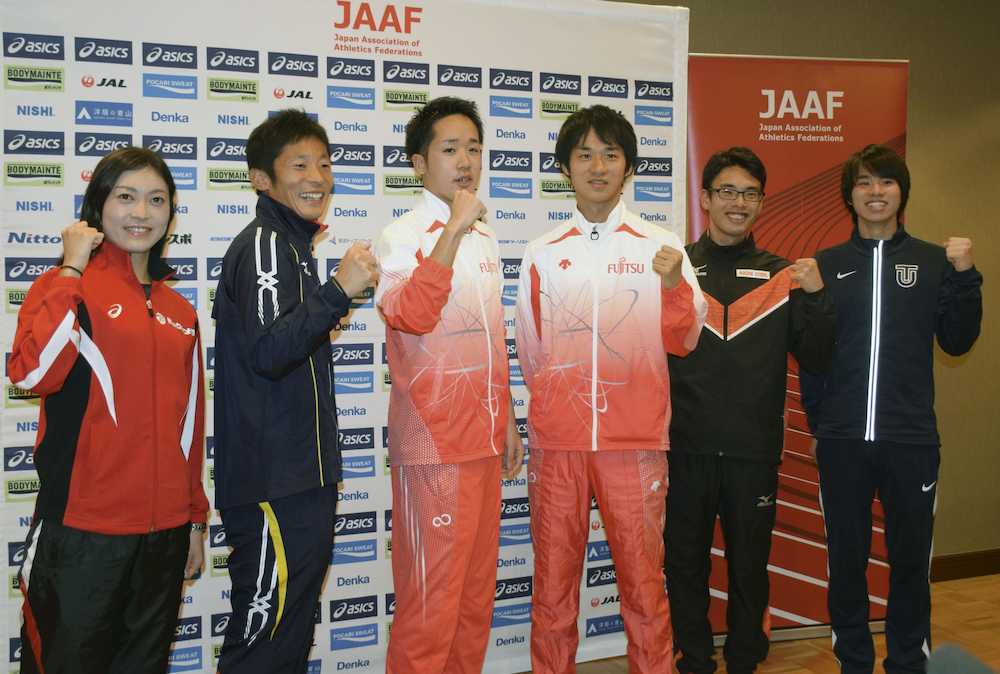 日本選手権20キロ競歩を前に、ポーズをとる高橋英輝(右から3人目)ら