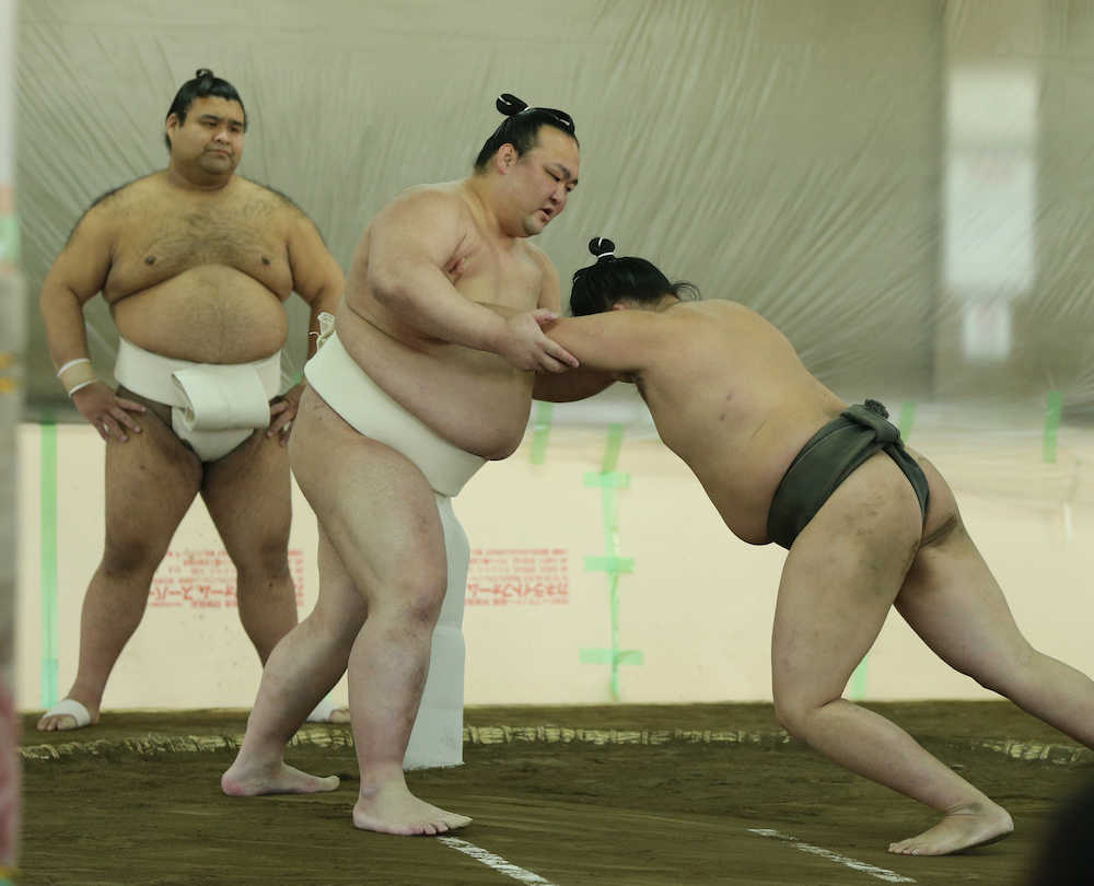 <田子ノ浦部屋稽古>田子ノ浦親方(左)が見る中、若手力士に稽古を指導する荒磯親方(左から2人目) (撮影・後藤 正志) Photo by スポニチ 荒磯親方見たい!園田競馬場内での稽古にファン大挙 投票所に土俵が… ギャラリーで見る この記事のフォト 2019年02月26日の画像一覧 もっと見る 2019年02月26日の画像をもっと見る