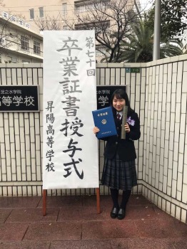 「昇陽高校在学中は、たくさんの応援いただきありがとうございました。本日、無事高校を卒業することができました。中学校への進学を機に大阪に来て6年、クラスメイトはもちろんですが、学校全体で応援してくれて、苦しい時も励みになっていました。海外遠征が続いて通えない日もありましたが、学校で過ごした時間は私にとって大切な思い出です。