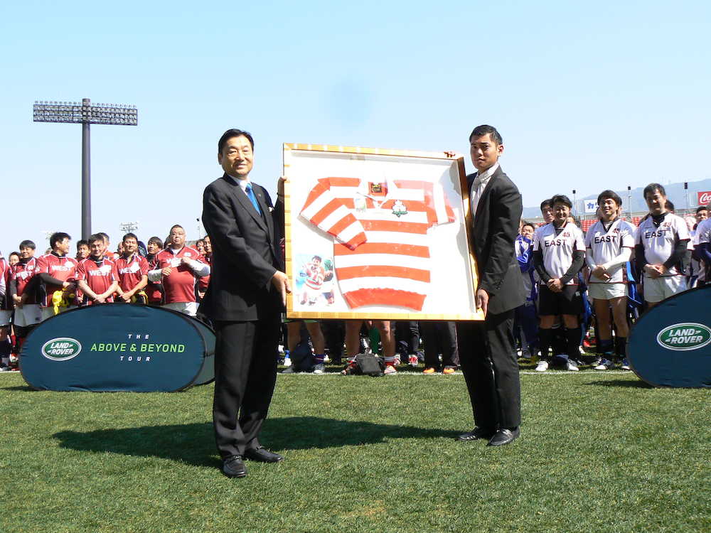 また、大会開会式ではサプライズイベントも行われた。「マスターズ2020」の開催に向け、大会ブランドの向上と周知拡大を主な目的として花園感動大使に任命された元日本代表監督の故・平尾誠二さん(享年53)が1995年のW杯南アフリカ大会で使用したジャージーを、長男・昂大(こうた)さんが東大阪の野田義和市長に寄贈する贈呈式が行われた。昂大さんは「感動大使に任命されて、家族で何かできないかと考え、父の姿を少しでも思い出してもらえればと思いジャージーを寄贈することを決めました」と説明。今後は花園ラグビー場内に飾ることが決まっている。