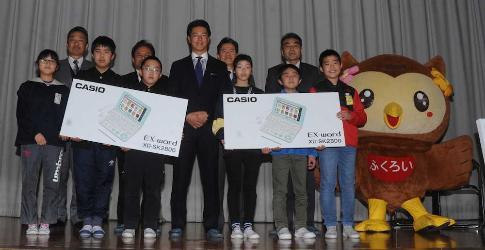 開幕前に3大会に出場する予定で「アイアンの精度を高め早い時期に優勝したい。選手会長としても、個人としても両方100%で今季を戦いたい」と熱弁。電子辞書の操作に夢中な小学生らを見て、満足そうな表情で同校をあとにした。(大木 穂高)