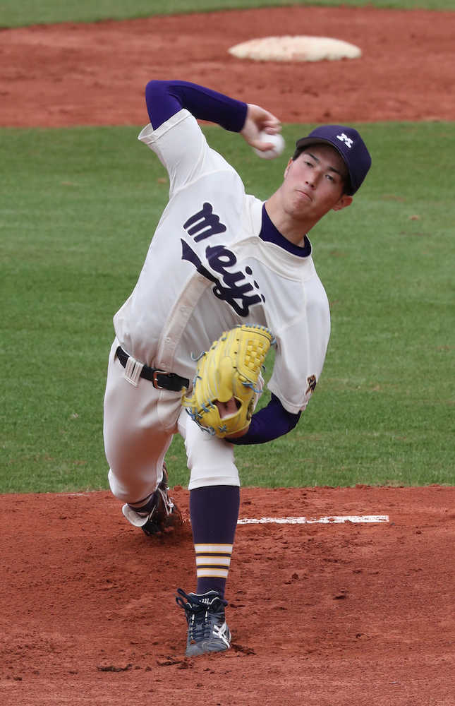 昨秋から工事していた明大球場の全面人工芝が完成、この日“こけら落とし”試合の国学院大戦が行われ、先発したエース森下暢仁が5回を1安打2失点、毎回の9奪三振で勝利に貢献した。