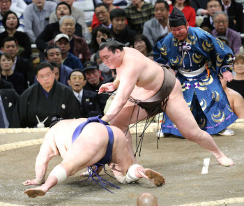 先場所に途中休場した横綱・白鵬は、新小結・北勝富士に突き落としで勝利。横綱・鶴竜は御嶽海に送り出しで敗れた。