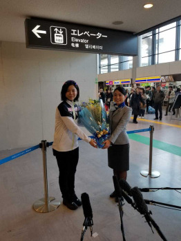 帰国して花束を受け取る高木美帆