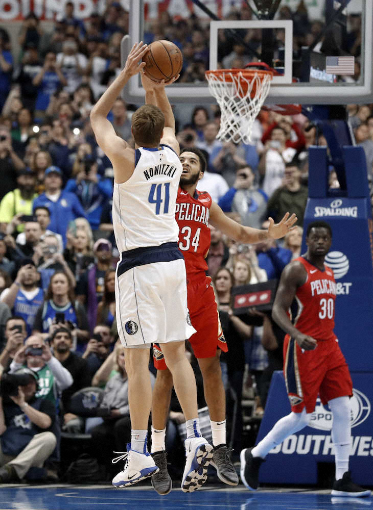NBAは18日に各地で9試合を行い、今季限りでの引退が噂されているマーベリクスのダーク・ノビツキー(40)が地元ダラスで行われたペリカンズ戦で、歴代6位となる通算得点記録を樹立した。