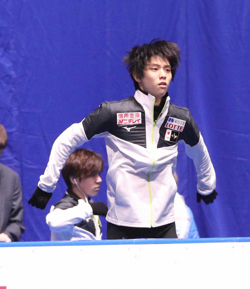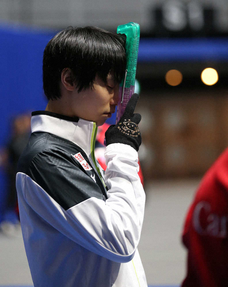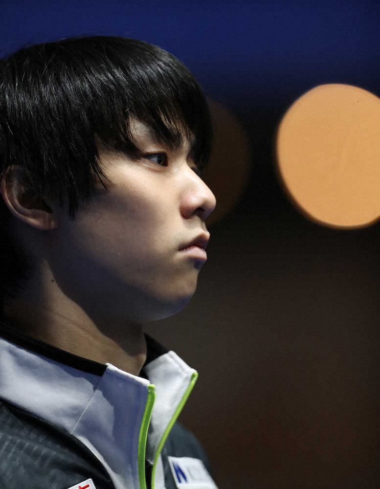 <世界フィギュア男子練習>本番SPへ。気合の入った表情の羽生結弦(撮影・長久保 豊)
