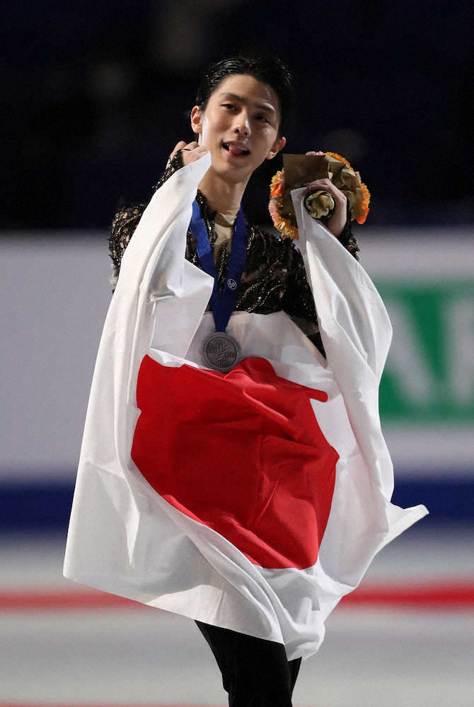<世界フィギュア・男子フリー>表彰式で舌を出しておどける羽生結弦(撮影・小海途 良幹)