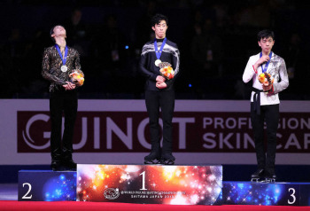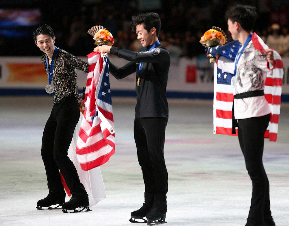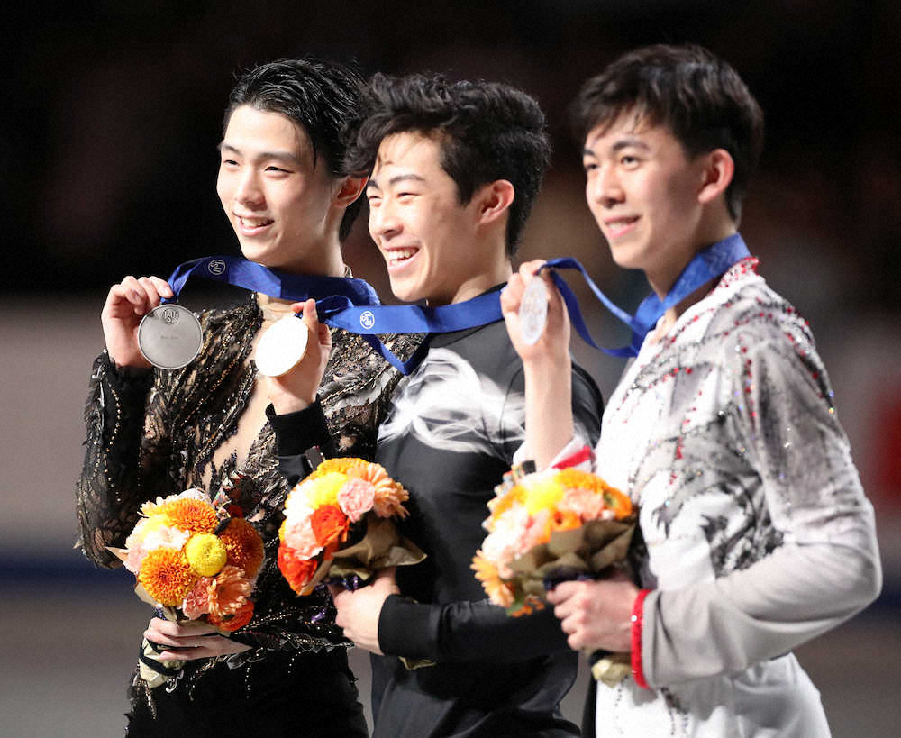 <世界フィギュア・男子フリー>表彰式で笑顔を見せる(左から)羽生結弦、ネーサン・チェン、ヴィンセント・ジョウ(撮影・小海途 良幹)