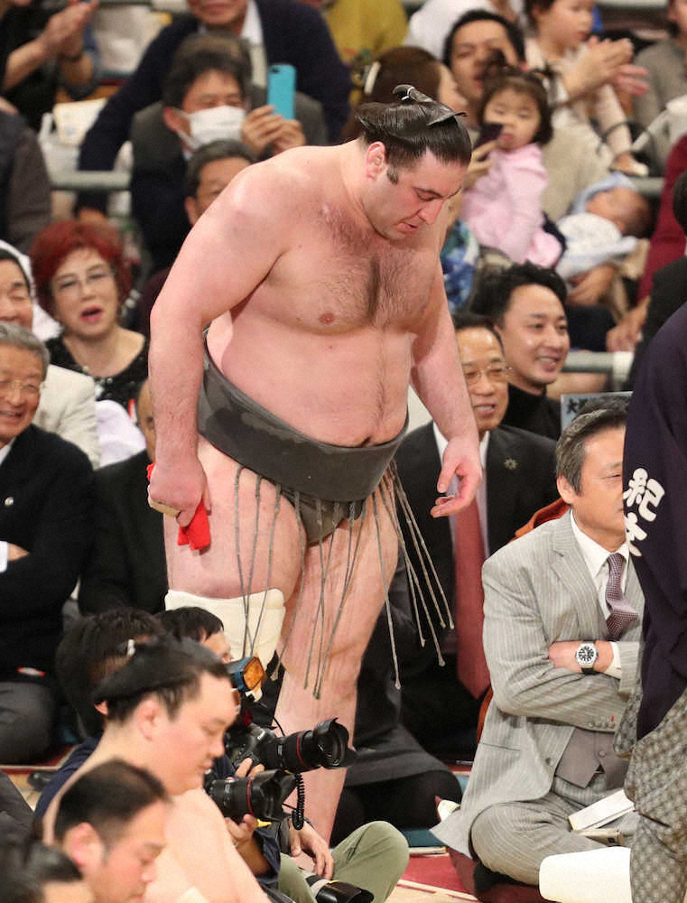 2日目に黒星を喫して3日目からは「気分を変えたくて」と、締め込みを、なす紺色のものから昨年初場所で初優勝したときの銀色のものに替えた。しかし、優勝時の相撲が戻らないまま夏場所で出直すことになった。