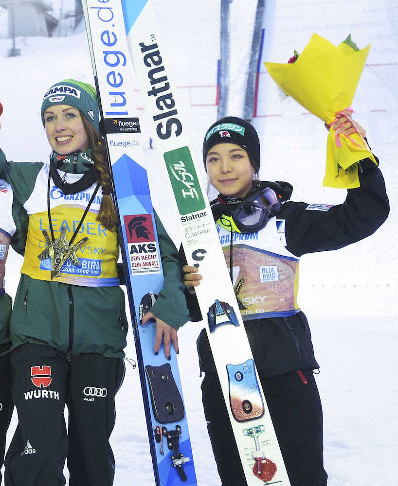 W杯ジャンプ女子個人第23戦で3位に入った高梨(右)