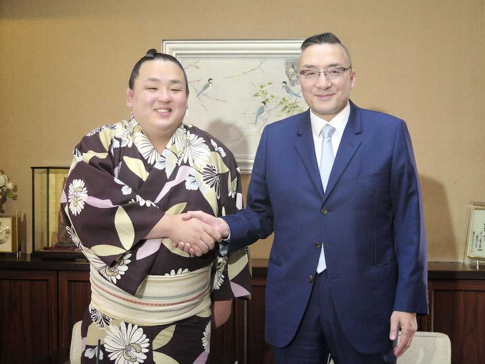 新十両昇進が決まり、錣山親方(右)と握手を交わす彩